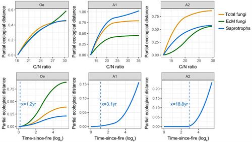 南京土壤研究所褚海燕课题组以大兴安岭不同火烧历史样地(火后1年、2年、8年、14年、30年、49年和260年)为研究平台,探究不同土层中真菌群落随火后恢复时间的动态变化。结果表明:在土壤有机层,随火后恢复时间增加,外生菌根真菌群落剧烈变化;在土壤矿质层,腐生真菌群落随火后恢复时间的变化呈滞后效应。火后恢复时间和土壤碳氮比分别是驱动土壤有机层和矿质层真菌群落变化的主要因素。此外,火烧历史打破了土壤真菌群落的距离衰减模式,即土壤真菌群落相似性不随空间距离增加而下降。以上结果阐明了不同土层中真菌群落的火后演替轨迹不同,火烧历史、土壤化学计量和空间距离共同驱动大兴安岭森林地下真菌群落,为我国北方退化森林的生态恢复与重建提供科学依据。该研究成果发表在New Phytologist上。