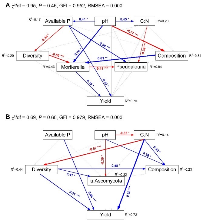结构方程模型揭示长期施肥对酸性土壤(A)和碱性土壤(B)土壤性质、真菌群落及作物产量的影响机制