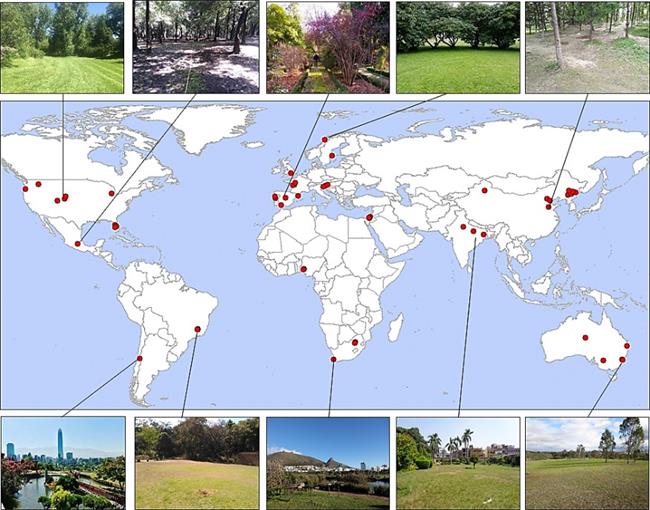 图1.六大洲17个国家56个被调查城市的地理位置以及它们的城市绿地景观图
