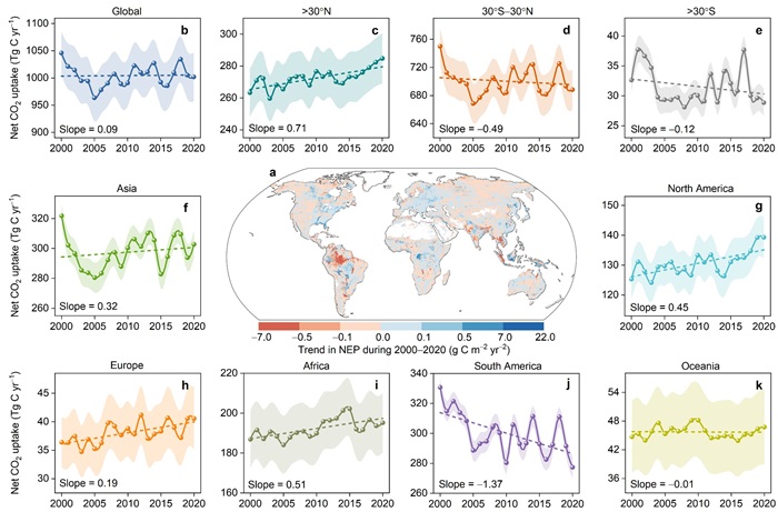 针对这一问题,中国科学院南京土壤研究所丁维新研究员团队基于全球原位观测数据,绘制了湿地水位时空分布图,结合环境因子数据库和机器学习方法评估了全球湿地碳汇的时空变异特征。研究发现,2000‒2020年全球湿地的平均固碳速率达到1004 Tg C year–1,其中70%来自热带湿地。2005年以前,全球湿地碳汇呈下降趋势,此后则逐步回升。过去20年,北半球中高纬度湿地碳汇持续增加,相反热带和南半球中高纬度湿地则呈下降趋势,总体上全球湿地生态系统碳汇能力维持相对稳定。不同区域湿地碳汇的差异主要受水文要素驱动,在全球气候变化背景下,日益加剧的水文极端事件将削弱湿地碳汇的韧性及其所支撑的生态系统服务功能。