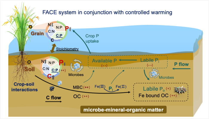 该研究团队此前曾在Nature Geoscience(2023, 16:162–168)发表研究成果,揭示单独升高CO₂浓度可通过增强作物吸磷量及收获移除量,导致土壤供磷能力随时间呈现“短期促进-长期受限”的演变特征。但在真实气候情景中,CO₂浓度升高往往与增温同步发生。增温可能显著改变生物过程与矿物相互作用模式,进而影响CO₂升高驱动下磷有效性的变化趋势。长期以来,关于增温究竟会加剧还是抵消CO₂浓度升高引发的磷限制效应,一直缺乏直接的试验证据,这极大地限制了面向气候变化的农田养分适应性管理策略的研发与应用。