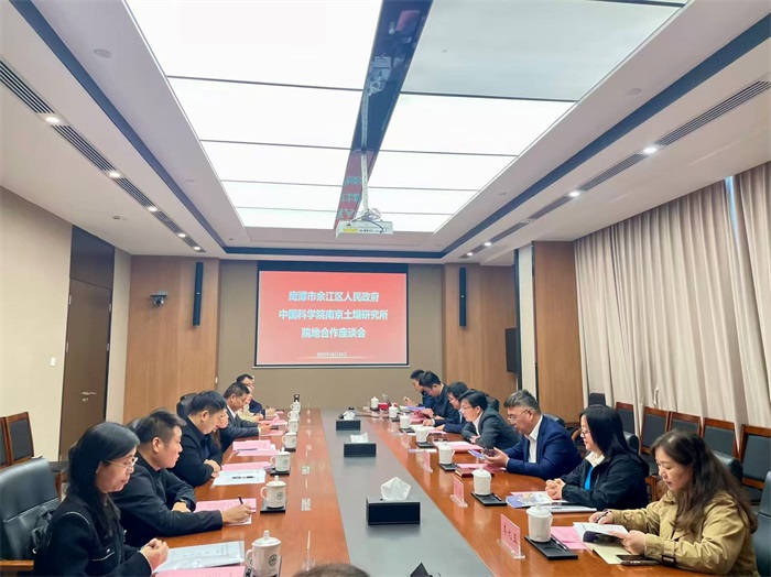 10月24日上午,南京土壤研究所与鹰潭市余江区人民政府在南京举行科技合作会谈,并签署战略合作框架协议。余江区委常委、组织部部长艾雯,区政府党组成员、副区长谢永敬及区委人才办、区科技局、余江工业园区、刘家站乡、区农投公司等相关负责人参会;南京土壤研究所党委书记华伟,所党政办公室、科技处、人事处、鹰潭站相关负责人及科研人员代表出席会议,会议由华伟主持。