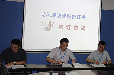 在随后进行的责任书签订仪式上,所长、党委书记与领导班子其他成员,所长、党委书记代表所领导班子与各研究部门及所办企业的主要负责人分别签订了责任书;根据分工,领导班子成员分别与其分管的职能部门和支撑部门主要负责人签订了责任书。根据安排,会后各研究部门主要负责人将与本部门科研团队(课题组)负责人、管理部门主要负责人与关键岗位人员分别签订责任书,科研团队(课题组)负责人还将向团队(课题组)所属成员发放廉洁从业警示书。