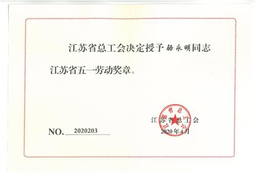 2020年4月26日,江苏省总工会下发《关于表彰江苏省五一劳动奖和江苏省工人先锋号的决定》(苏工发〔2020〕5号),我所骆永明同志被授予“江苏省五一劳动奖章”。